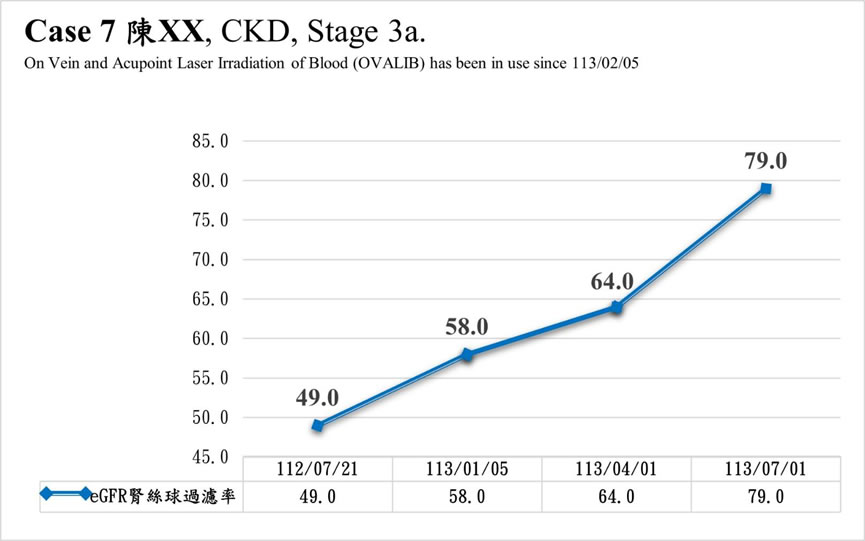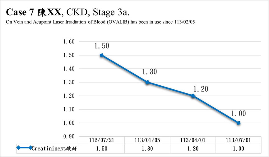 一位70歲的先生,患有慢性腎臟功能異常已經多年,經朋友介紹來診所治療,起初半信半疑,經過抽血驗證後信心大增,已經由第三期進步到第二期,臉色及皮膚顏色都獲得改善,十分高興,目前持續治療中。